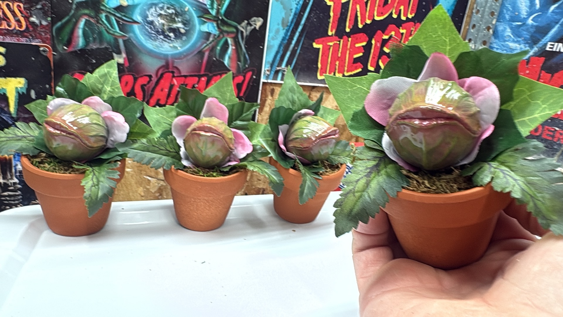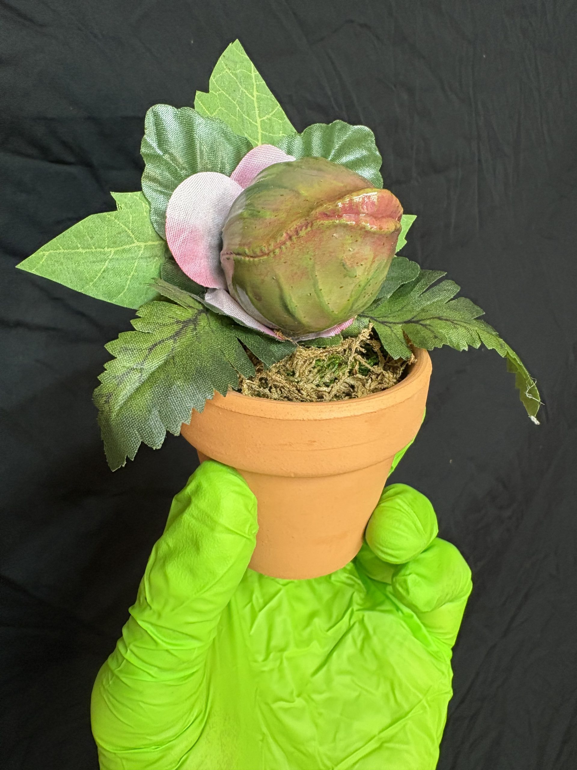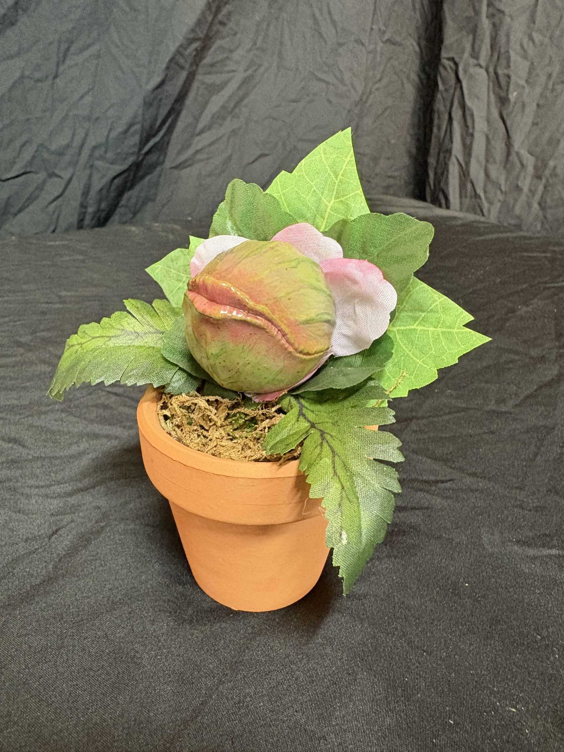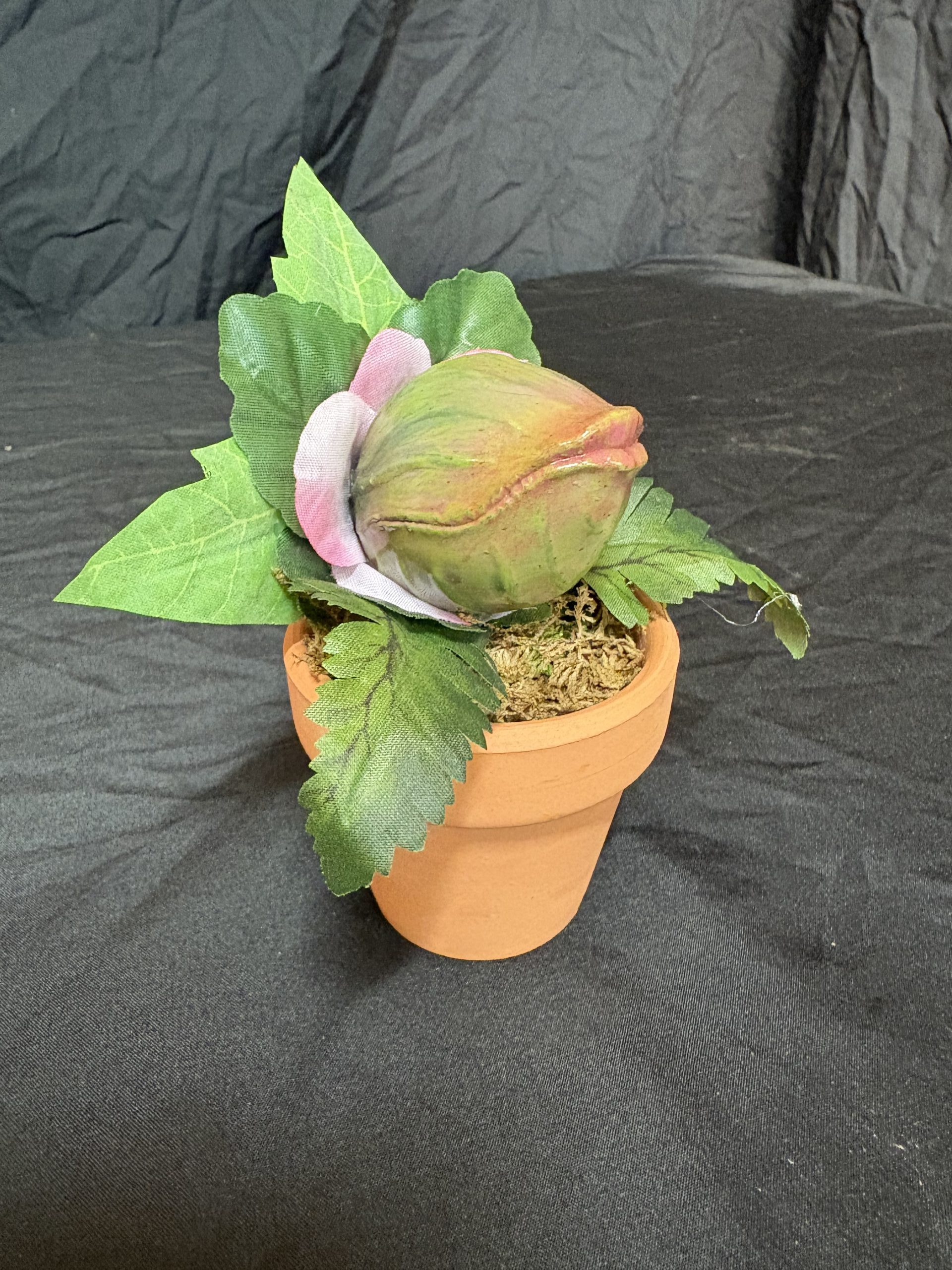 Hand painted resin plant pod with added leaves in terra cotta pot.